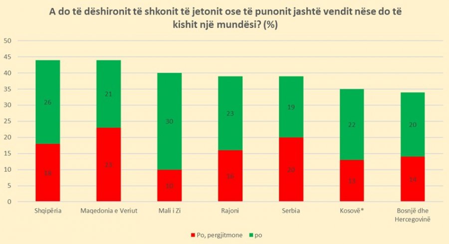 Plot 44% e të anketuarve deklaruan se do të donin të shkonin të jetonin ose të punonin jashtë vendit, një përqindje që e vendos vendin tonë mbi mesataren rajonale dhe mbi të gjitha ekonomitë e tjera të përfshira në sondazh dhe në nivel të njëjtë me Maqedoninë e Veriut.