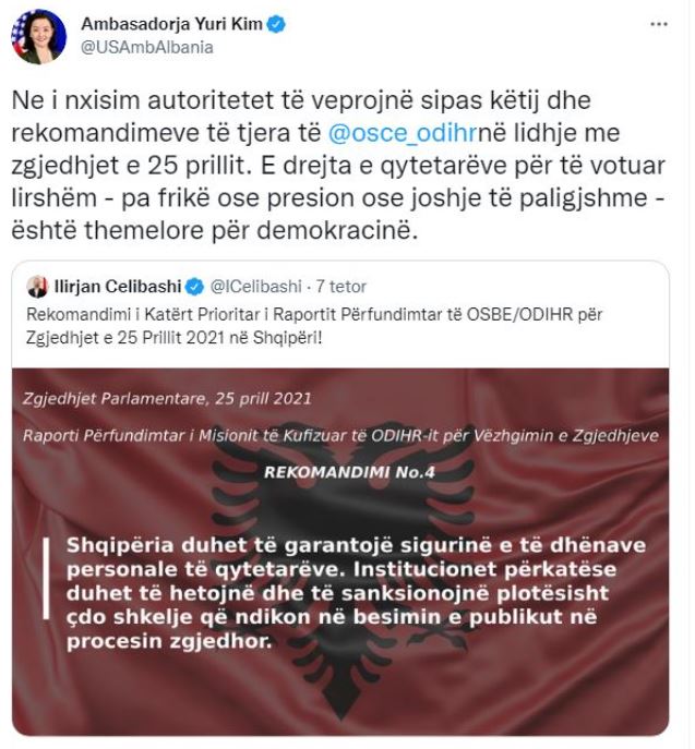 Ambasadorja e SHBA Yuri Kim u ka bërë apel autoriteteve të veprojnë sipas rekomandimeve të @osce_odihr në lidhje me zgjedhjet e 25 prillit. Duke shpërndarë në Twitter statusin e kreut të KQZ Ilirjan Celibashi rekomandimin e katërt të OSBE/ODIHR, Kim shkruan se është e drejta e qytetarëve për të votuar lirshëm, pa frikë ose presion ose joshje të paligjshme.
