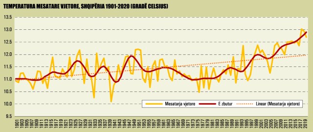 - E njëjta gjë vërehet edhe te temperaturat minimale dhe maksimale vjetore që kanë tendencë rritje, sidomos në 10 vitet e fundit