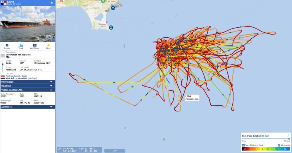 Në pamje të parë, LEO II është një përdorues i rregullt i detit, me flamur panamez dhe menaxhim nga kompania greke Sea Trade Marine SA — as anija dhe as kompania nuk figurojnë në asnjë listë sanksionesh të BE-së, SHBA-së apo OKB-së. Por, siç zbulohet nga të dhënat e lëvizjeve detare, kjo anije “e pastër” ndodhet në një nga pikat më të njohura të Mesdheut për operacionet e transbordimit të naftës (STS) – shkëmbimin e ngarkesave mes anijeve në det të hapur.