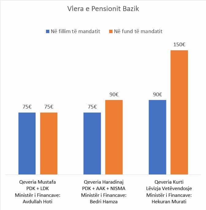 Pensioni Bazik të cilin e gjetëm me vlerë 90 euro/muaj në fillim të mandatit, prej sot procesohet me rritje me vlerë 150 euro/muaj. Pra 60 euro rritje brenda mandatit, apo 67%.