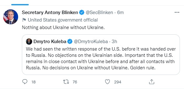 Sekretari Amerikan i Shtetit, Blinken i është përgjigjur një postimi në Twitter të ministrit të Jashtëm të Ukrainës Dmitry Kuleba mbi përgjigjen që NATO dhe SHBA-të i dhanë Rusisë në kuadër të negociatave për uljen e tensioneve në kufi.