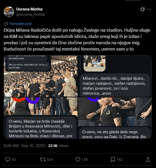 Llogaria “Usrana Motka” shkruan se grupi i Radoiçiqit erdhi me urdhrin e Zhvallegës dhe se ishin të gatshëm të terrorizonin të pranishmit në stadiumin e Beogradit.