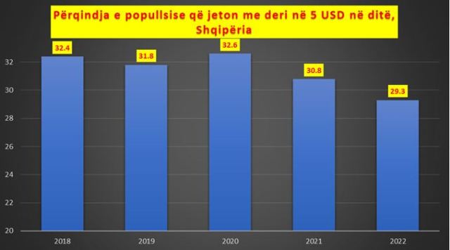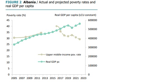 Shqipëria po përjeton rritjen më të lartë ekonomike në Rajon, por në të njëjtën kohë vendi ka një të tretën e popullsisë që jeton në varfëri relative me më pak se 5 dollarë në ditë. Sipas Bankës Botërore, këtë vit 30.8 % e popullsisë jeton në varfëri dhe fenomeni do të jetë i qëndrueshëm deri në vitin 2023, ku 29.3 % e popullsisë së vendit do të jetojë me pak se 5 dollarë në ditë.