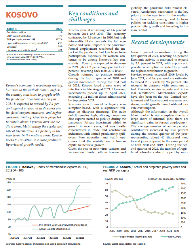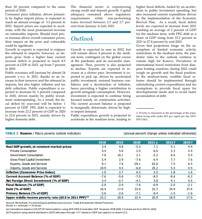 “Aktiviteti ekonomik në vitin 2021 pritet të zgjerohet me 7.1 për qind kundrejt një rikthimi të mërgatës, masave mbështetëse fiskale dhe rritja e huadhënies. Modeli i rritjes së Kosovës është kryesisht i bazuar në konsum, me një mbështetje të konsiderueshme nga mërgata”, thuhet raport.