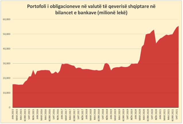 Portofoli i obligacioneve në valutë të qeverisë shqiptare në bilancet e bankave shënoi një rritje të ndjeshme veçanërisht në tremujorin e dytë të vitit të kaluar, pas shpërthimit të pandemisë. Në atë periudhë, qeveria shqiptare emetoi një obligacion dyvjeçar prej 120 milionë eurosh në tregun e brendshëm, si edhe Eurobond prej 650 milionë euro në tregjet ndërkombëtare. Bankat ishin financuesi kryesor i obligacionit kombëtar, por edhe një ndër blerësit kryesorë të Eurobondit.