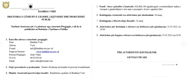 Në muajin maj 2021, Bashkia e Vorës hapi tenderin “e kufizuar në kuadër të procesit të rindërtimit”. Nga keto tenderët e mbyllur që bëhen me mërrëveshje me palët, atje ku për fatkeqësinë po derdhen paratë lumë te një numër i vogël firmash. Objekti i tenderit është “rindërtimi i godinës së Bashkisë Vorë”, me vlerë 618,868,546 lekë pa TVSH. Specifikohej se kohëzgjatja e kontratës ka qenë për 16 muaj, ndërsa në fund firmëtari ishte kryetari i komanduar Gentian Picari.