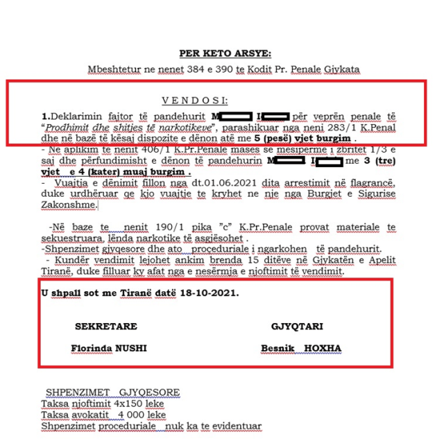 Në 18 Tetor të këtij viti, gjyqtari Besnik Hoxha vendosi dënimin e 19-vjeçarit M.I., me 5 vite burgim, për akuzën e “prodhimit dhe shitjes së lëndëve narkotike”.
