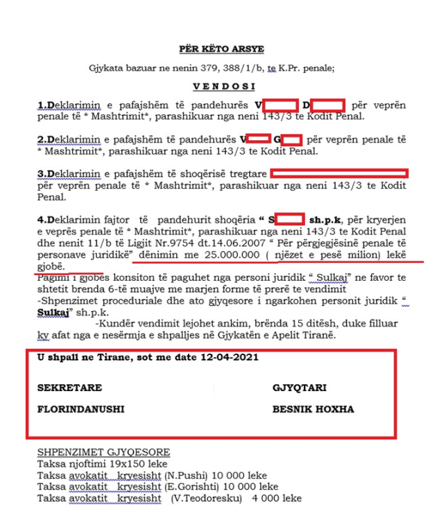 Në 12 Prill të vitit 2021, Besnik Hoxha vendosi të gjobisë subjektin tregtar “S…” shpk, për veprën penale “Mashtrimi”, pavarësisht se kjo vepër penale ishte krijuar nga pronari i saj dhe jo nga subjekti tregtar.