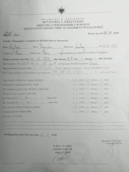 “Pasi u depozituan aktet nga organi i ekzekutimit të vendimeve penale, ne konstatuam që, Myrteza Çaushi, bazuar në dinamikën e vuajtjes së dënimit ka vuajtur deri më datën 06.11.2020, 20 vite e 10 muaj burgim. Ndërkohë, i njëjti institucion, në muajin qershor të vitit 2020 ka paraqitur një dinamikë tjetër në të cilën thuhet që Myrteza Çaushi ka vuajtur 25 vite e 2 muaj burgim. Në këto dy periudha Zani Çaushit i kanë humbur 4 vite burgim sepse kështu e ka llogaritur IEVP.