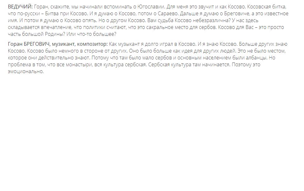 MODERATORI: Goran, më thuaj, filluam të mendojmë për Jugosllavinë. Për mua, gjithashtu tingëllon si Kosovë. Beteja e Kosovës, e cila në rusisht është Beteja e Kosovës. Dhe unë mendoj për Kosovën, pastaj për Sarajevën. Më tej mendoj për Bregovic, dhe ky është një emër i njohur. Dhe pastaj mendoj përsëri për Kosovën. Por për një Kosovë tjetër. A ju intereson fati i Kosovës? Ne kemi përshtypjen këtu se politikanët besojnë se ky është një vend i shenjtë për serbët. A është Kosova vetëm një pjesë e një atdheu të madh për ju? Apo diçka më të madhe?