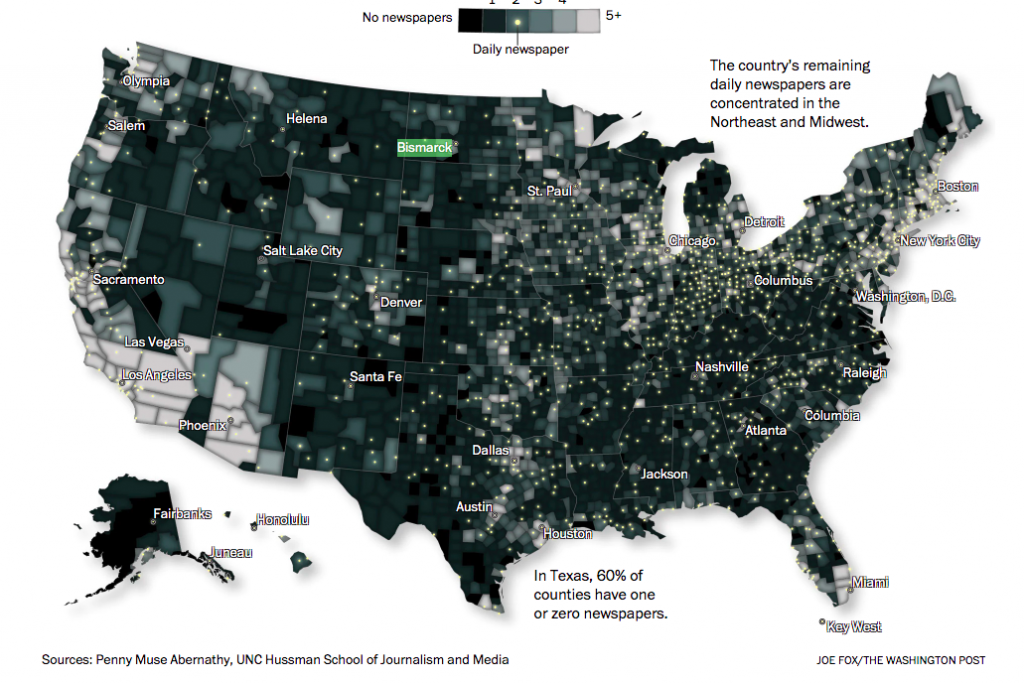 Një peizash i gjerë i gazetave të humbura midis Janarit 2005 dhe Dhjetorit 2020, rreth një e katërta e gazetave të shtypura lokale në SHBA pushuan së botuari, sipas të dhënave që profesori veriperëndimor Penny Muse Abernathy mblodhi ndërsa ishte në Universitetin e Kalifornisë së Veriut. Deri në vitin 2020, nga mbi 3000 qarqe të SHBA-së, gjysma kishin vetëm një gazetë të shtypur lokale të çdo lloji. Vetëm një e treta e kishte një gazetë të përditëshme. Mbi 200 qarqe nuk kishin asnjë gazetë.