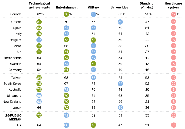 Një mesatare tjetër prej 45% vlerëson kapacitetin ushtarak të amerikanëve, dhe së fundmi universitet amerikane vlerësohen si më të mirat nga 16% dhe mbi mesataren nga 43% e 16 ekonomive më të forta në botë si Kanadaja, Gjermania, Franca etj.