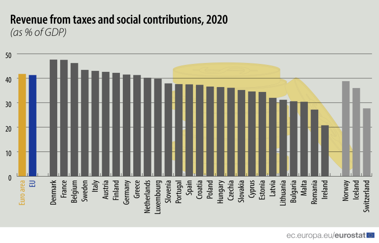 Në total, taksat dhe kontributet sociale përbënin mesatarisht 41.3% të Prodhimit të Brendshme Bruto në BE.