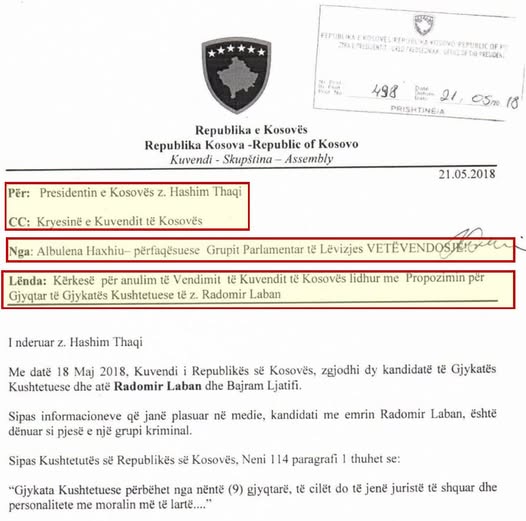 Kur Radomir Laban, në gusht të vitit 2018 u votua me 71 vota për anëtar të Gjykatës Kushtetuese të Kosovës dhe kur Presidenti Thaqi e dekretoj, përkundër faktit të njohur se i njëjti është dënuar me 6 vjet burg në Serbi për krim të organizuar ndërkombëtar; përkundër kërkesës zyrtare nga përfaqësuesje e grupit parlamentar të LVV Albulena Haxhiu të mos dekretohet; kur Eulexi refuzoj burgosjen e tij përkundër ekzistencës së fletarrestimit të lëshuar nga Interpoli qysh në vitin 2014.