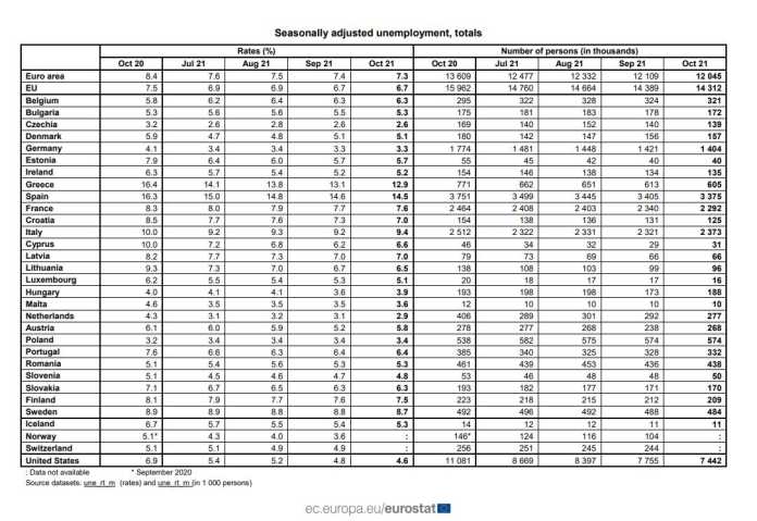 Niveli i papunësisë në Bashkimin Evropian në tetor ka shkuar në 7.3 për qind, rreth 1 për qind më pak se sa një vit më parë. Çekia rezulton se e ka vetëm 2.6 për qind nivelin e papunësisë.