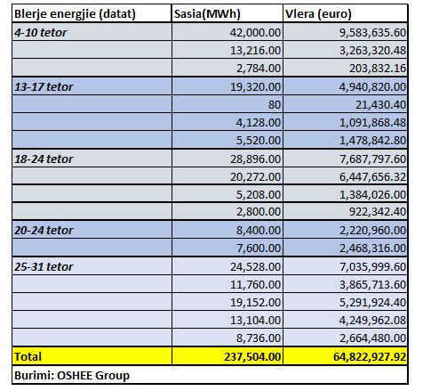 Për datat nga 4 tetori deri në 31 tetor janë blerë në treg të lirë mbi 237 mijë MWh energji, çka bën që çmimi mesatar me të cilën është siguruar një megavat/orë është rreth 273 euro/ MWh.