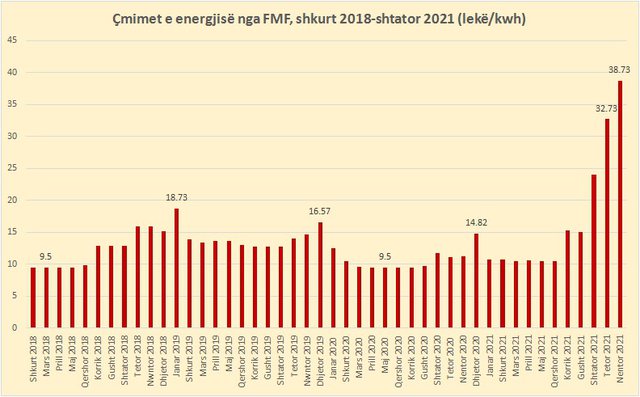 Në muajin nëntor të vitit të shkuar, çmimi i një kilovat/orë ishte 38.73 lekë.