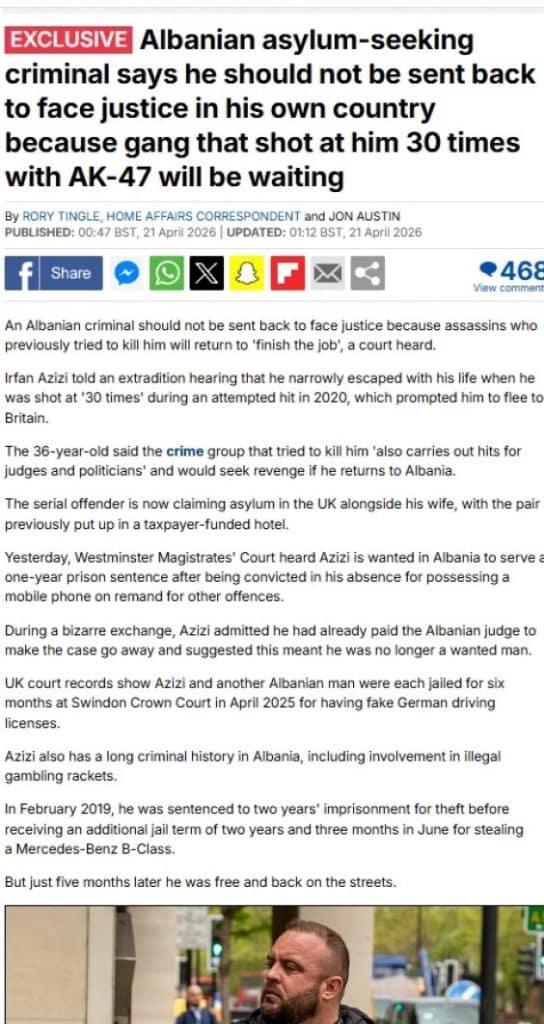 Daily Mail në një shkrim ekskluziv zbulon detaje nga seanca gjyqësore ku Irfan Azizi kërkon të mos ekstradohet pasi nëse kthehet në Shqipëri “do të më vrasin dhe, për të mos ndodhur kjo, do të më duhet t’i vras unë ata, gjë që nuk dua ta bëj.”