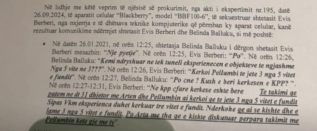 Sipas dokumenteve të publikuara, komunikimet janë zbuluar në aparatin celular “Blackberry” të sekuestruar Berberit gjatë hetimeve për procedime tenderimi. Në dosje citohet se më 26 janar 2021, Balluku dhe Berberi kanë shkëmbyer disa mesazhe në lidhje me ndryshimin e kritereve të një tenderi për ndërtimin e tunelit: