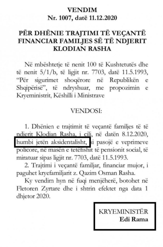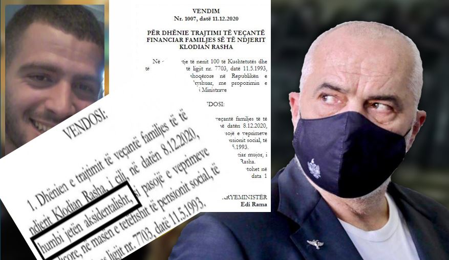 Me një akt të denjë për ato që kemi parë me familjet e 26 viktimave të Gërdecit, qeveria Rama ka tentuar të blejë sot gjakun e Klodian Rashës. Por edhe në ato pak rreshta të vendimit të kabinetit, që i lidh familjes një pension të përmuajshëm, nuk është evituar dot tentativa për manipulim. Me një vendim të firmosur me dorën e vet, Edi Rama e ka shpallur vrasjen policore të Klodian Rashës si “humbje jete aksidentale”.