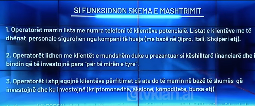 Në fillim, operatorët marrin lista me numra të telefonit të klientëve potencial, ku sigurohen nga kompani të huaja me bazë në Qipro, Itali, Shqipëri, etj. Pastaj, operatorët lidhen me klientët e mundshëm duke u prezantuar si këshilltarë financiarë dhe i bindin që të investojnë para “për të mirën e tyre”.