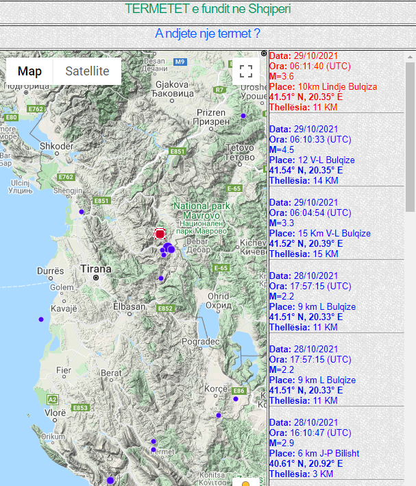 Ndërkohë që veçmas tërmetit në Tiranë, në zonën e Bulqizës kanë rënë disa tërmete gjatë 24 orëve të fundit. Mbi 6 tërmete janë ndjerë në atë zonë, ndërkohë që sipas të dhënave nga Instituti i Gjeoshkencës, bëhet me dije se tërmeti me madhësi më të madhe ka qenë 4.5 të shkallës Rihter. Ky tërmet ështe ndjerë edhe në disa qytete të tjera të vendit, ndërkohë që në Bulqizë banorët e fikësuar kanë dalë jashtë shtëpive me shpejtësi. Teksa kanë treguar për momentin e frikshëm, ata janë shprehur se mirë që nuk ishte tërmet më i fortë.