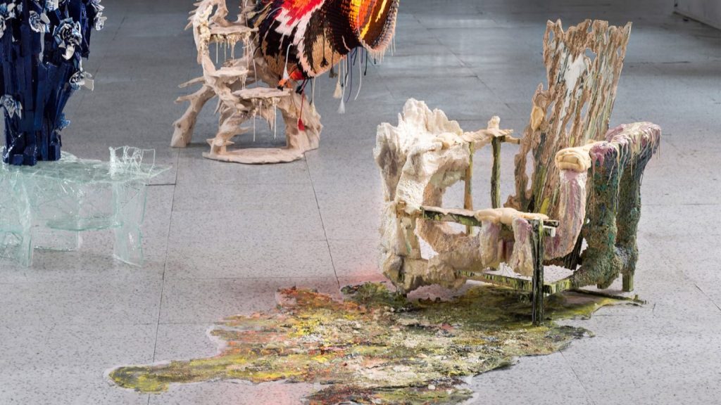 Një karrige aspak e zakonshme është krijuar nga Bower Studios në New York. Është një bazë metalike dhe sipër saj është vendosur beton. Deri këtu duket normale. E veçanta qëndron se duket sikur betoni po shkrin dhe bie duke u palosur në dysheme.