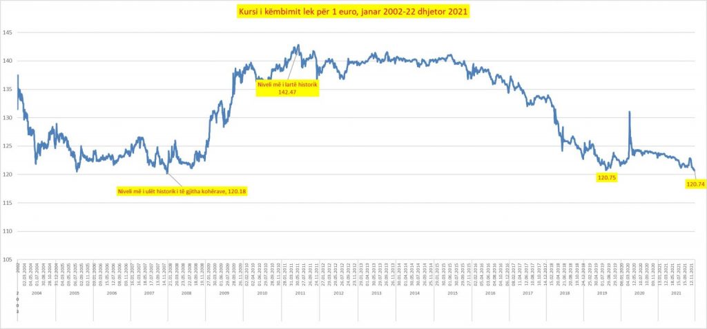 Rënia e monedhës europiane në kursin e këmbimit me lekun ka shënuar një rekord të ri për 14 vitet e fundit. Sipas kursit zyrtar të këmbimit të Bankës së Shqipërisë, euro u këmbye të mërkurën me 120.66 lekë, niveli më i ulët që nga dhjetor i vitit 2007.