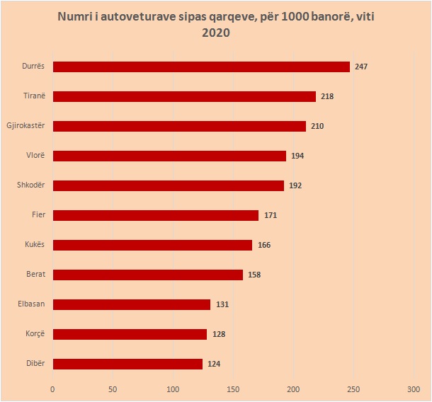 Qarqet që kanë më pak automjete në raport me popullsinë janë Korça me 128 vetura dhe Dibra me 124 vetura.