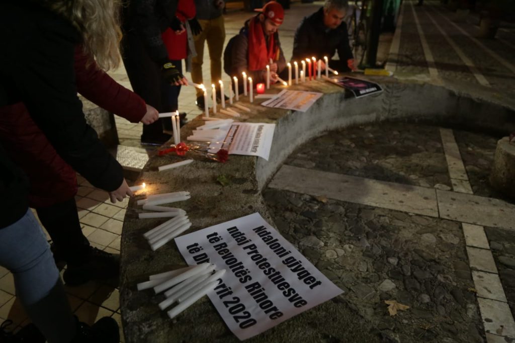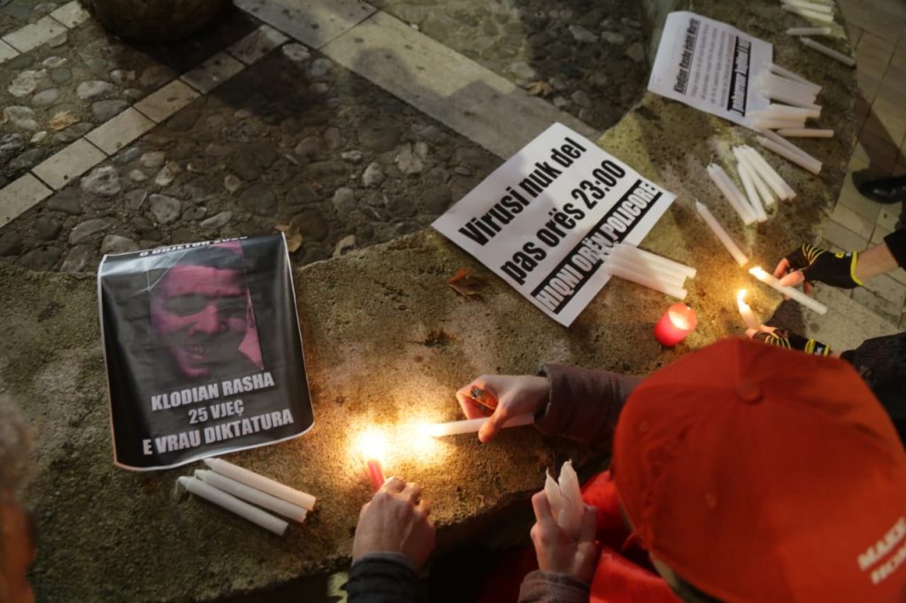 “E vrau diktatura”, thuhet në një nga pankartat, ndërsa në një tjetër shkruhet: “Virusi nuk del pas orës 23:00”, duke iu referuar këtu arsyes se përse i riu u kërkua nga policia që të ndalonte.