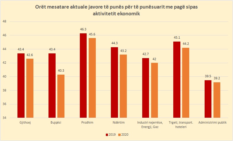 Meshkujt punuan 0.7 orë më pak në javë në vitin 2020, ndërsa femrat 0.8 orë më pak. Sipas aktiviteteve ekonomike, sektorët ku të punësuarit qëndrojnë më gjatë në punë janë prodhimi, me 45.6 orë gjithsej, të ndjekura nga tregtia, akomodimi, hoteleria (44.2) ndërtimi (43.2), industria (42). Më e privilegjuar është administrata shtetërore, e cila punon mesatarisht 39.2 orë në javë, ose 3.4 orë në javë më pak sesa mesatarja kombëtare.