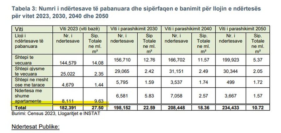 Por përveç banesave të veçuara, Shqipëria ka një stok të madh banesash të pabanuara edhe në katgorinë e ndërtesave me shumë apartamente. Sipas të dhënave të dokumentit, aktualisht janë 9.63 milionë metra katrorë të pabanuara në kategorinë e ndërtesave me shumë apartamente. Pjesa dërrmuese e tyre janë pallate.