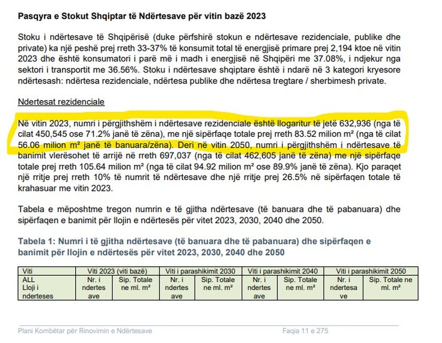 “Në vitin 2023, numri i përgjithshëm i ndërtesave rezidenciale është llogaritur të jetë 632,936, me një sipërfaqe totale prej rreth 83.52 milion m², nga të cilat 56.06 milion m² janë të banuara/zëna,” thuhet në dokumentin shoqërues të projektligjit për rinovimin e stokut të ndërtesave.