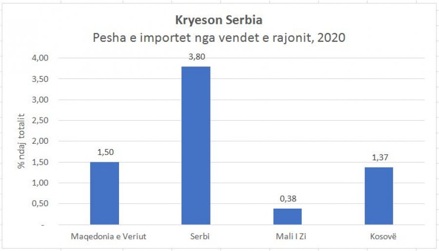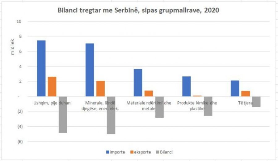 Serbia është burimi kryesor i importeve në rajon. Sipas INSTAT, në vitin 2020 importuam nga ky shtet mallra me vlerë 23 miliardë lekë (3.8% e totalit), ndërsa eksportet ishin vetëm 6.3 miliardë lekë. Bilanci është negativ, me 16.7 miliardë lekë (134 milionë euro), që ikin neto drejt Serbisë. Serbia dominon në shitjet drejt Shqipërisë të ushqimeve, pijeve e duhanit, mineraleve, lëndëve djegëse e energjisë, si dhe materialeve të ndërtimit e metaleve. Në të kundërt me Serbinë, për të gjitha grup mallrat, bilanci tregtar është negativ.