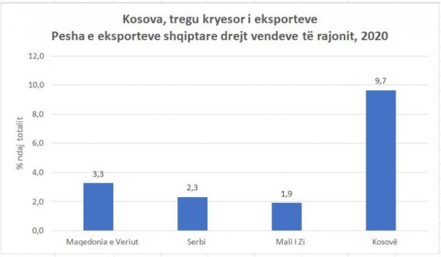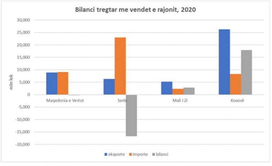 Shqipëria realizoi me vendet e rajonit, Serbinë, Kosovën, Malin e Zi, Maqedoninë e Veriut rreth 10% të volumit tregtar (importe + eksporte) në vitin 2020, sipas të dhënave të INSTAT, të përpunuara nga “Monitor” (të dhënat për Bosnjën nuk janë në tabelat e INSTAT).
