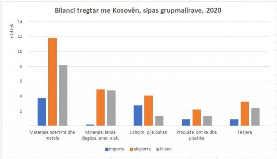 Për eksportet, Kosova është partneri kryesor i Shqipërisë dhe shteti ku ne kemi suficitin më të lartë tregtar, që nënkupton se eksportojmë më shumë drejt këtij vendi, sesa importojmë prej tij. Në vitin 2020, eksportet drejt Kosovës ishin 26.2 miliardë lekë (9.7% e shitjeve totale jashtë vendit), ndërsa importet 8.3 miliardë lekë, me bilanc pozitiv 18 miliardë lekë (145 milionë eurosh). Mallrat kryesore që eksportojmë në Kosovë janë materialet e ndërtimit e metalet (kryesisht çeliku, tullat, çimento), lëndë djegëse e energji (naftë) dhe ushqime, pije e duhan. Për të gjitha grupmallrat, vlera e eksporteve është më e lartë sesa e importeve.