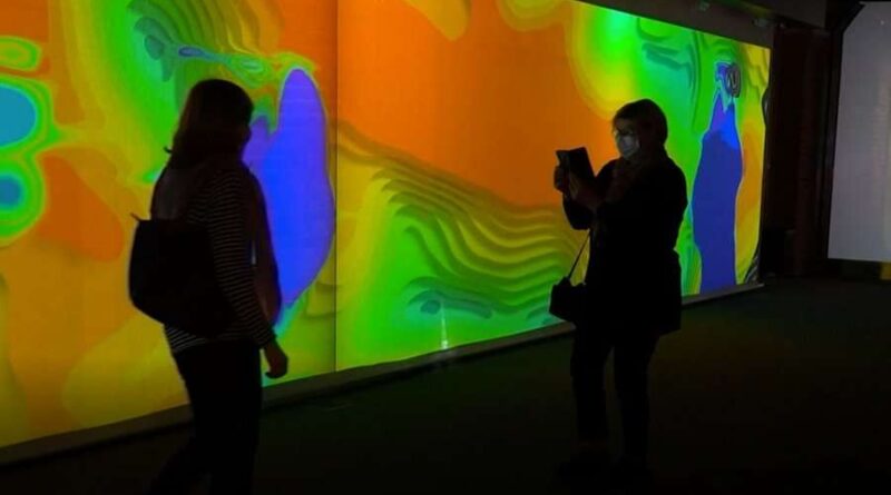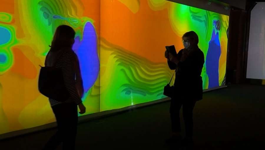 Me një valëzim të dorës vizitorët mund të dërgojnë valë shumëngjyrëshe përgjatë mureve të galerisë ose të lëshojnë një vorbull kubesh digjitale.