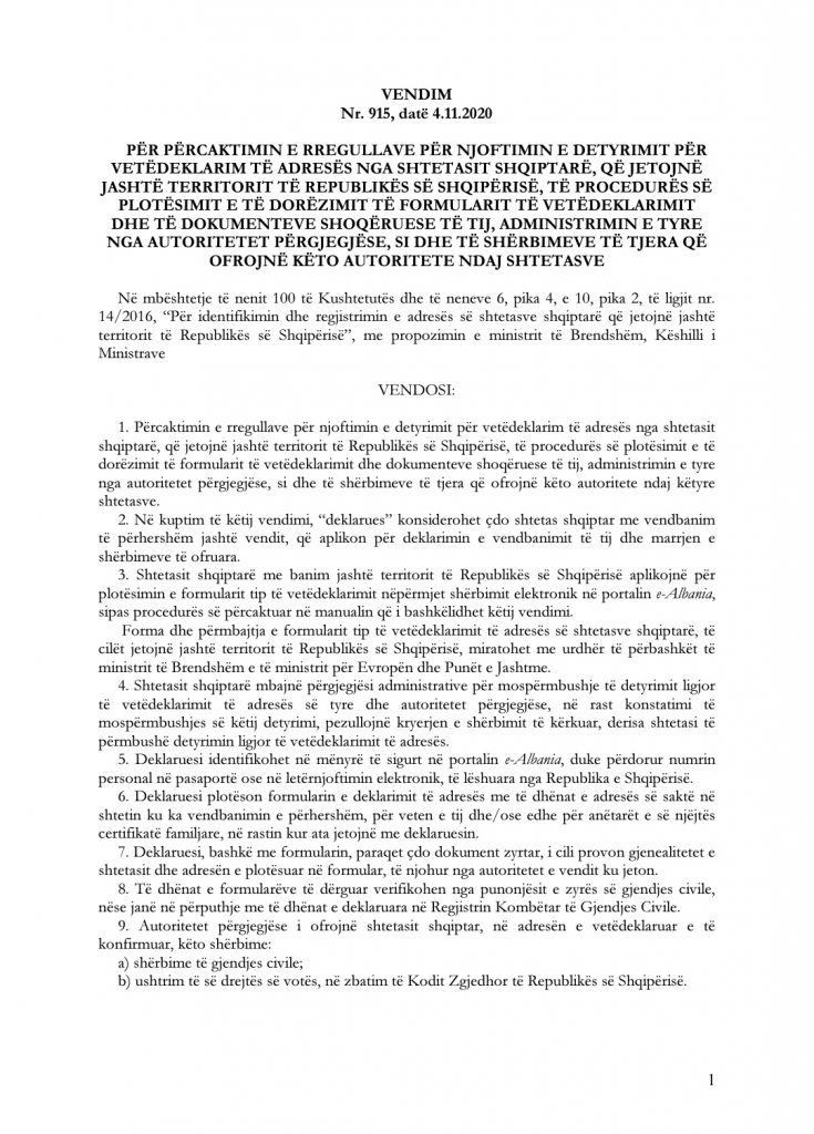 Në pikën 4 të tij thuhet se “shtetasit shqiptarë mbajnë përgjegjësi administrative për mospërmbushje të detyrimit ligjor të vetëdeklarimit të adresës së tyre dhe autoritetet përgjegjëse, në rast konstatimi të mospërmbushjes së këtij detyrimi pezullojnë kryerjen e shërbimeve të kërkuara, derisa shtetasi të përmbushë detyrimin ligjor të vetëdeklarimit të adresës”.