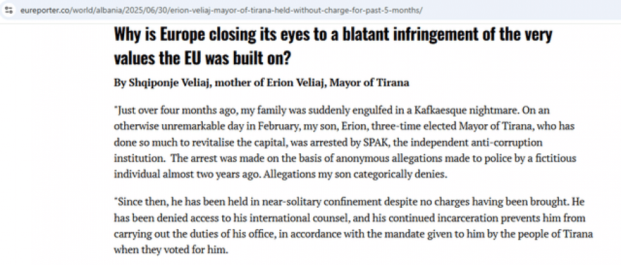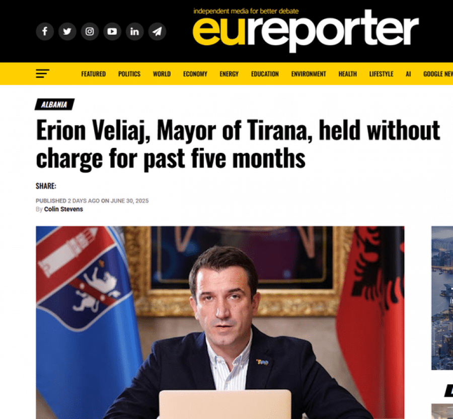 Më 30 qershor 2025, portali ndërkombëtar i EU Reporter publikoi një artikull me titullin: “Erion Veliaj, Mayor of Tirana, held without charge for past five months”. Në pamje të parë, një lajm i zakonshëm.