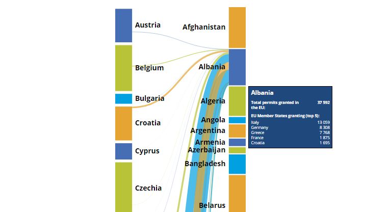 Në total në vitit 2020 shtetet e Bashkimit Europian dhanë 37.6 mijë leje qëndrimi për herë të parë për shtetasit shqiptarë. E para renditet Italia, me 13,059 leje. E dyta është Gjermania me 8,308 leje, e treta është Greqia me 7,768, e ndjekur nga Franca me 1,875 dhe Kroacia me 1,695 leje qëndrimi për herë të parë.
