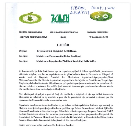 Shoqata e Eksportuesve Shqiptarë të Fruta-Perimeve, Këshilli i Agrobiznesit Shqiptar (KASH) dhe Sindikata e Fermerëve, në një letër drejtuar kryeministrit Edi Rama, ministres së Financave dhe Ekonomisë, Delina Ibrahimaj, dhe ministres së Bujqësisë dhe Zhvillimit Rural, Frida Krifca, kundërshtojnë propozimet e paketës fiskale 2022.