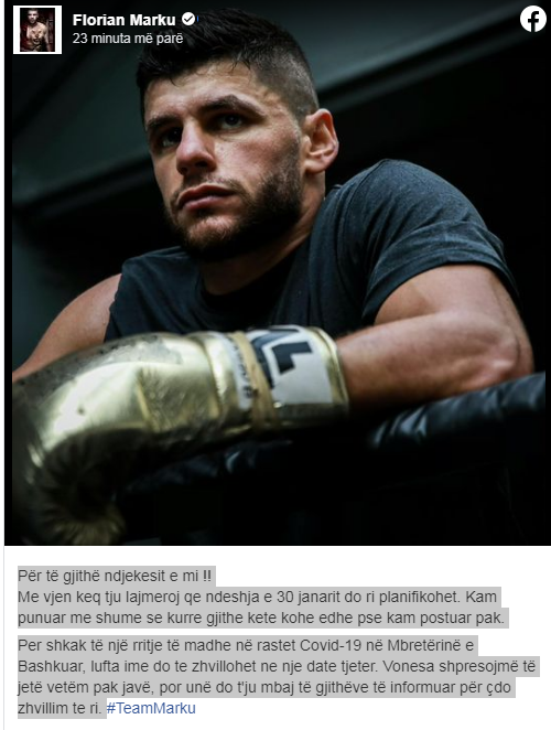 Përballja e 30 janarit u anulua për shkak të rritjes së rasteve me Covid-19 në Mbretërin e Bashkuar. Lajmi është konfirmuar nga vetë luftëtari shqiptar, nëpërmjet një postimi në faqen zyrtare në “Facebook”. Marku shkruan se ‘lufta’ e tij do të zhvillohet në një datë tjetër, por që nuk është përcaktuar ende.
