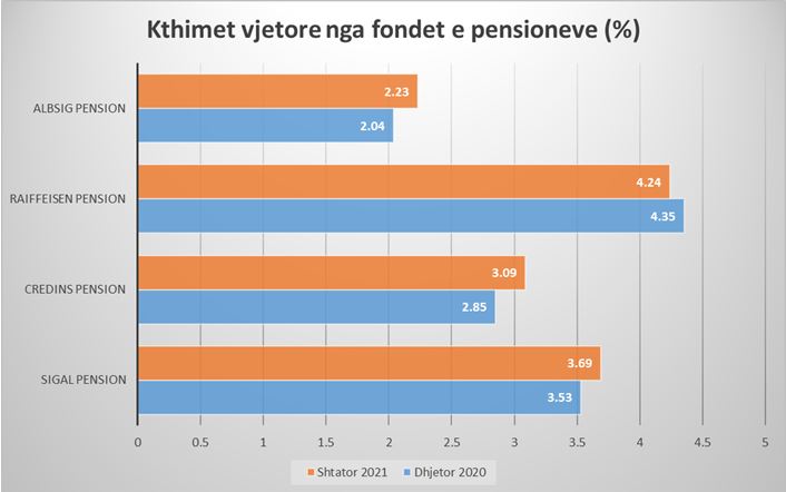 Pasi pësuan një rënie të lehtë gjatë vitit 2020, kthimet në fondet e pensioneve po shfaqin një tendencë drejt rimëkëmbjes gjatë vitit 2020. Këto fonde kanë një politikë investimesh në instrumente me rrezik të ulët, të përqendruara në shumicën dërrmuese në obligacione afatgjatë të qeverisë shqiptare. Edhe kthimet nga fondet, në afatin e gjatë, janë të varura nga performanca e këtyre instrumenteve.