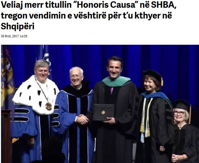 Në foto: Lajmi i datës 30 prill 2017, ku njoftohet se kryebashkiakut Veliaj i është akorduar titulli “Doctor Honoris Causa”, i publikuar në media në atë kohë