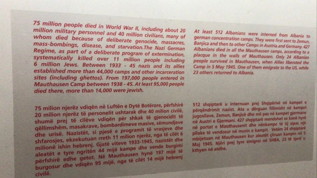 Me fakte, dokumente, foto, audio dhe video për historinë e të mbijetuarve shqiptarë të Mauthausenit, një ekspozitë multimedia që tregon historinë e shkurtër të nazizmit në Shqipëri, si erdhën, si e gjetën Shqipërinë, si nisi rezistenca shqiptare ndaj tyre, cilat ishin momentet dhe përplasjet më të forta të ushtrisë gjermane në Shqipëri.