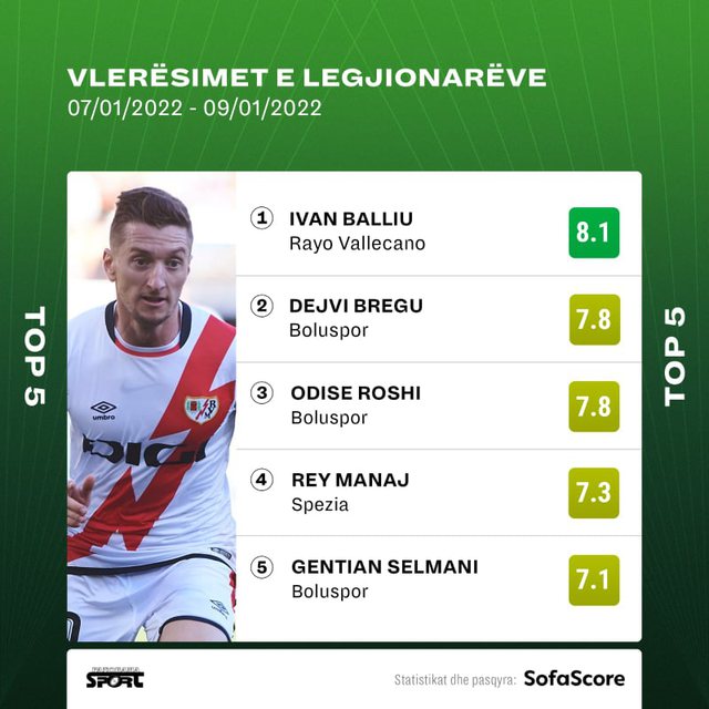 I katërti renditet sulmuesi i Kombëtares, Rei Manaj, i cili është vlerësuar me notën 7,3 dhe ka spikatur me paraqitjet e tij me ekipin e Specias.