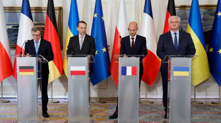 Grupi prej tre vendeve, i njohur si Trekëndëshi i Vajmarit, mbështeti miratimin e shpejtë të paketës së 19-të të sanksioneve të propozuara nga BE-ja, e cila për herë të parë do të sanksiononte kompanitë në vendet e treta që mbështesin financiarisht përpjekjet e luftës së Rusisë, siç janë rafineritë e naftës që përpunojnë naftën ruse. Ai gjithashtu propozon futjen e një embargoje të plotë të BE-së ndaj gazit natyror të lëngshëm rus. Një embargo e përgjithshme nuk ekziston ende, por kufizime të rëndësishme janë vendosur tashmë.