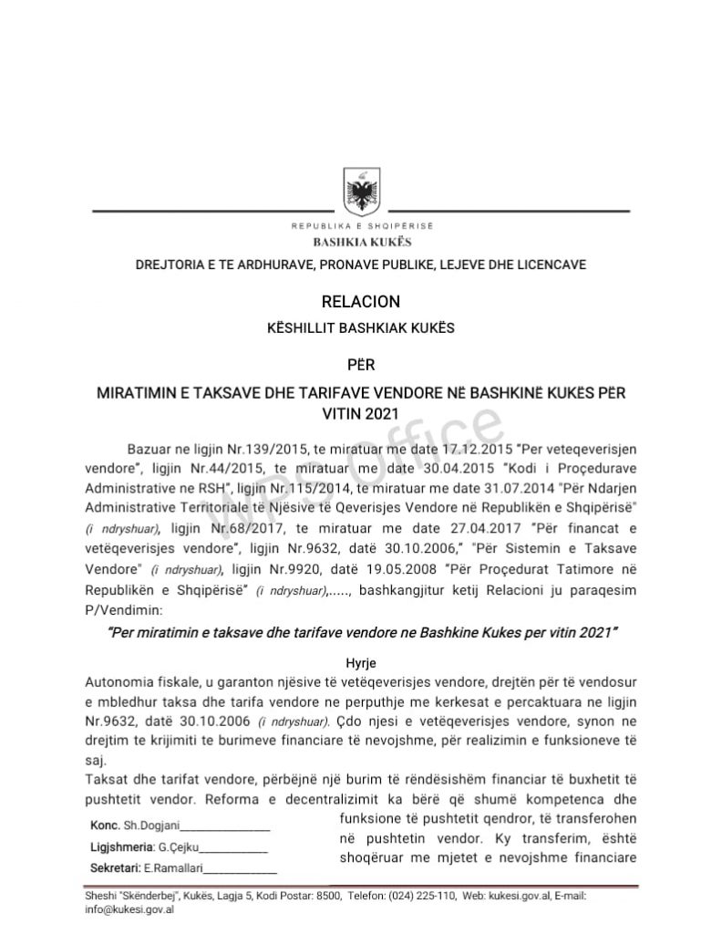 Drejtoria e të ardhurave, pronave publike, lejeve dhe licencave në Bashkinë Kukës, në një relacion dërguar Këshillit Bashkiak, kërkon miratimin e taksave dhe tarifave vendore në këtë bashki gjatë vitit 2021.