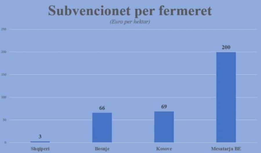 Rritja e kostove të prodhimit kanë qenë vetëm njëra anë e politikave antiprodhim. Ana tjetër është mungesa e subvencioneve. Fermerët shqiptarë marrin 20 herë më pak subvencione se sa fermerët e vendeve fqinje, madje edhe ato më të varfra si Kosova. Konsideroni vetëm një tregues. Sipas FAO-s, qeveria shqiptare jep 3 euro subvencione për hektar, ndërsa Bosnja dhe Kosova japin respektivisht 66 dhe 69 euro subvencione për hektar.